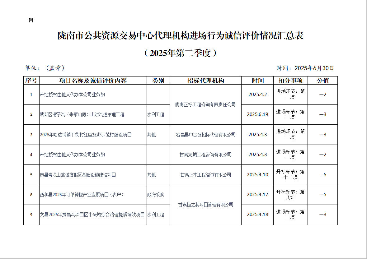 隴南市公共資源交易中心關(guān)于2025年第二季度
