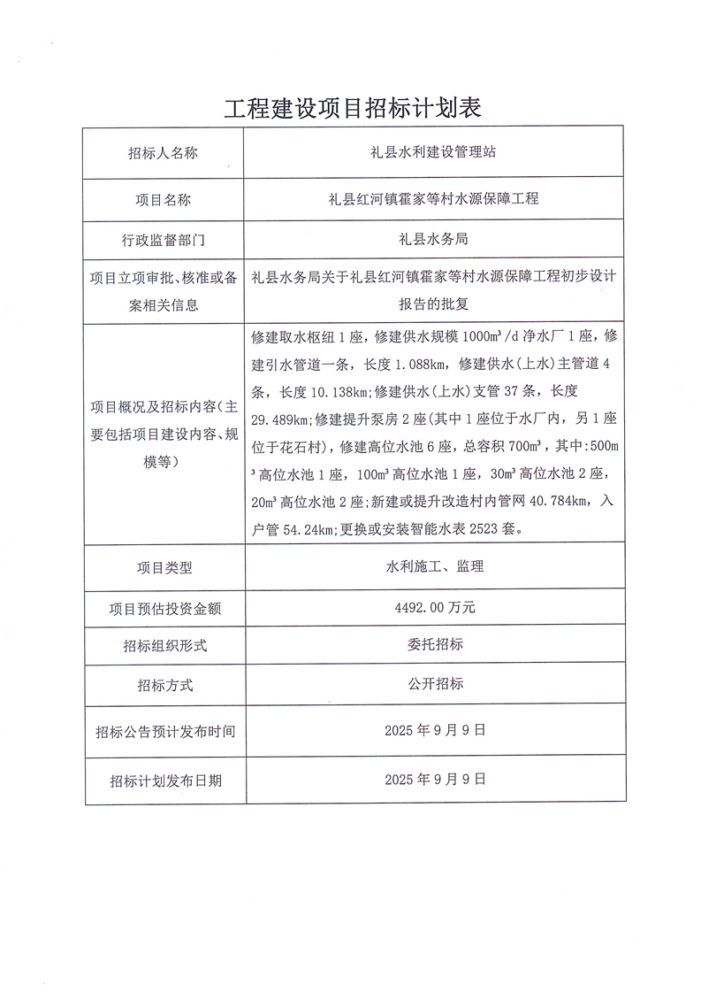 禮縣紅河鎮(zhèn)霍家等村水源保障工程
